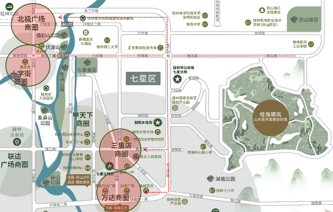 ? ? ? 我們在此重構桂林的誠摯款待,尋回山水人文的城市溫情,以人文藝術場所、自然體驗、精神療愈、休閑運動、教育研學、城市居停和活動歡聚構造桂林首席旅居勝地。創(chuàng)意街區(qū)配套、健康生活配套、藝文美學配套,度假居住配套、全齡教育配套,多維滿足0-100歲人群的生活需求,成為居住者的一生之城。