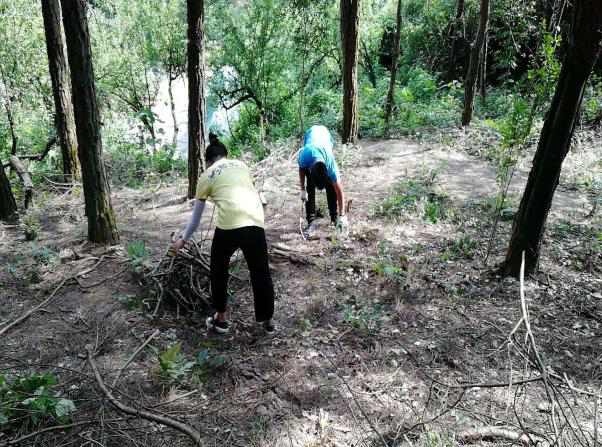 清場(chǎng):場(chǎng)地路面的枯枝與雜草處理。先是樹上的枯藤殘刺,身高不夠,我們就穿上裝備去到平臺(tái)上切割。地上雜草叢生,我們就一棵一棵的連根拔起。然后找來鮮騰捆好,一捆捆的背下山來。排除一切的蛇鼠蟲蟻,為游客的舒心加把安全鎖。